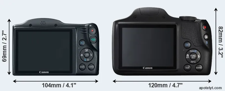 The physical size and weight of the Canon SX400 and the Canon SX540 are illustrated in the side-by-side display below. The two cameras are presented according to their relative size. Three successive views from the front, the top, and the rear are shown. All width, height and depth measures are rounded to the nearest millimeter.