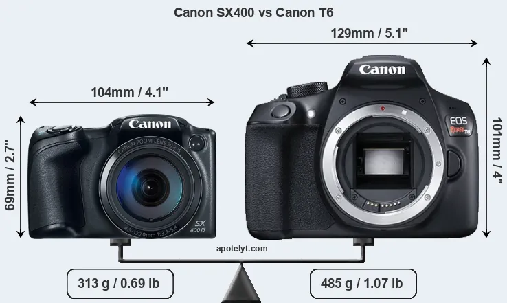 An illustration of the physical size and weight of the Canon SX400 and the Canon T6 is provided in the side-by-side display below. The two cameras are presented according to their relative size. Three consecutive views from the front, the top, and the rear side are shown. All width, height and depth measures are rounded to the nearest millimeter.