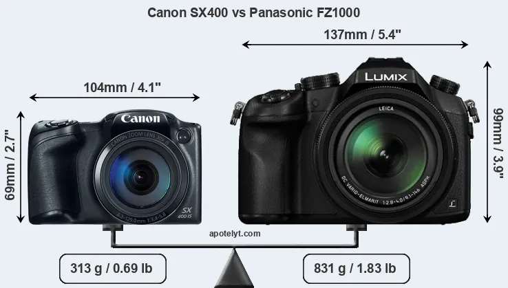 The side-by-side display below illustrates the physical size and weight of the Canon SX400 and the Panasonic FZ1000. The two cameras are presented according to their relative size. Three consecutive perspectives from the front, the top, and the back are available. All size dimensions are rounded to the nearest millimeter.