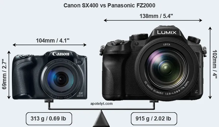 An illustration of the physical size and weight of the Canon SX400 and the Panasonic FZ2000 is provided in the side-by-side display below. The two cameras are presented according to their relative size. Three successive views from the front, the top, and the rear are shown. All width, height and depth dimensions are rounded to the nearest millimeter.