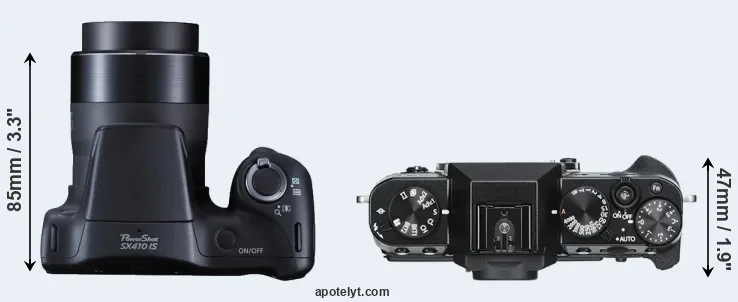 The physical size and weight of the Canon SX410 and the Fujifilm X-T30 are illustrated in the side-by-side display below. The two cameras are presented according to their relative size. Three consecutive perspectives from the front, the top, and the back are available. All width, height and depth measures are rounded to the nearest millimeter.
