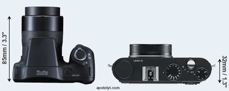 The physical size and weight of the Canon SX410 and the Leica X1 are illustrated in the side-by-side display below. The two cameras are presented according to their relative size. Three successive views from the front, the top, and the rear are shown. All size dimensions are rounded to the nearest millimeter.
