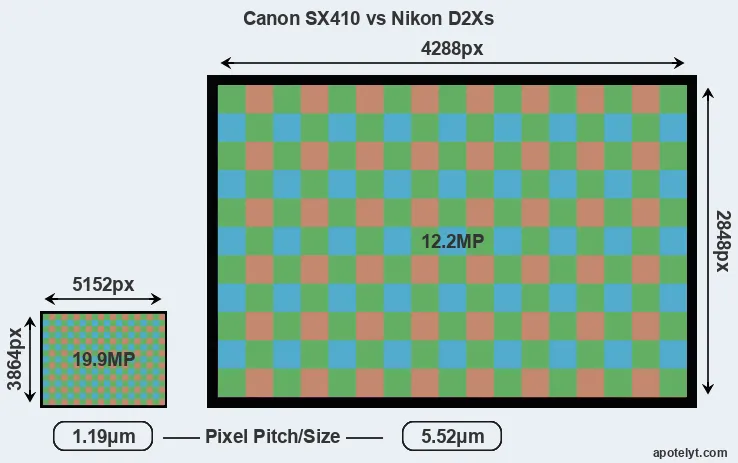 Despite having a smaller sensor, the Canon SX410 offers a higher resolution of 19.9 megapixels, compared with 12.2 MP of the Nikon D2Xs. This megapixels advantage comes at the cost of a higher pixel density and a smaller size of the individual pixel (with a pixel pitch of 1.19μm versus 5.52μm for the D2Xs). However, it should be noted that the SX410 is much more recent (by 8 years and 8 months) than the D2Xs, and its sensor will have benefitted from technological advances during this time that make it possible to gather light more efficiently. Coming back to sensor resolution, it should be mentioned that the SX410 has no anti-alias filter installed, so that it can capture all the detail its sensor resolves.