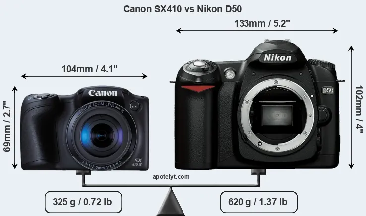 The physical size and weight of the Canon SX410 and the Nikon D50 are illustrated in the side-by-side display below. The two cameras are presented according to their relative size. Three successive views from the front, the top, and the rear are shown. All width, height and depth dimensions are rounded to the nearest millimeter.