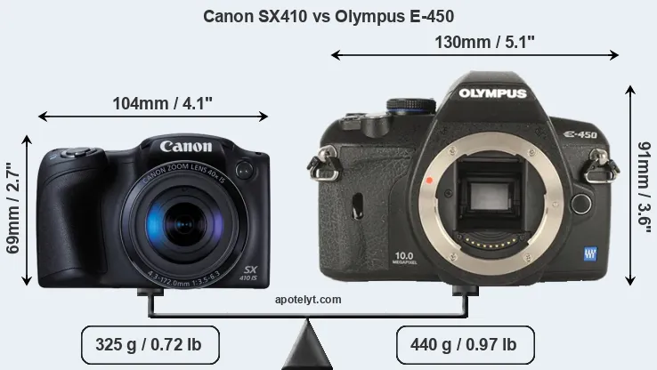 The above size and weight comparisons are to some extent incomplete and possibly misleading, as the SX410 has a lens built in, whereas the E-450 is an interchangeable lens camera that requires a separate lens. Attaching the latter will add extra weight and bulk to the setup. You can compare the optics available for the E-450 and their specifications in the Four Thirds Lens Catalog.
