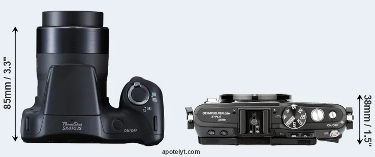 The side-by-side display below illustrates the physical size and weight of the Canon SX410 and the Olympus E-PL5. The two cameras are presented according to their relative size. Three successive views from the front, the top, and the rear are shown. All width, height and depth dimensions are rounded to the nearest millimeter.