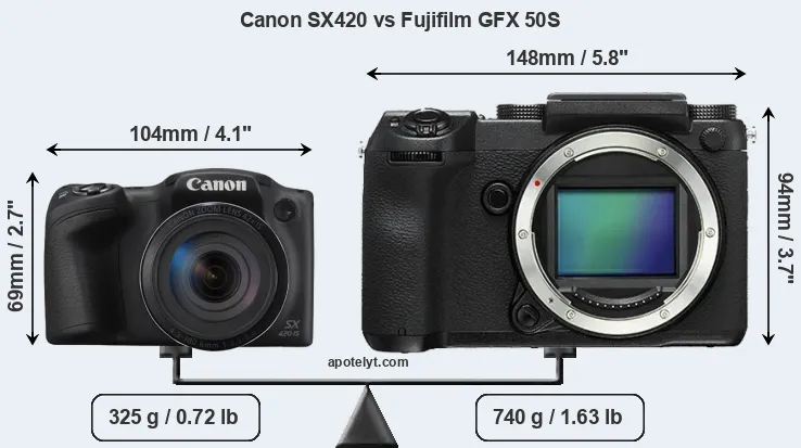 The side-by-side display below illustrates the physical size and weight of the Canon SX420 and the Fujifilm GFX 50S. The two cameras are presented according to their relative size. Three consecutive perspectives from the front, the top, and the back are available. All size dimensions are rounded to the nearest millimeter.