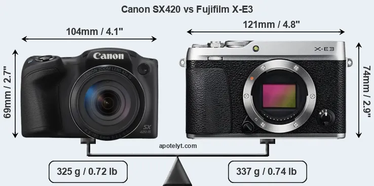 The side-by-side display below illustrates the physical size and weight of the Canon SX420 and the Fujifilm X-E3. The two cameras are presented according to their relative size. Three successive views from the front, the top, and the rear are shown. All size dimensions are rounded to the nearest millimeter.