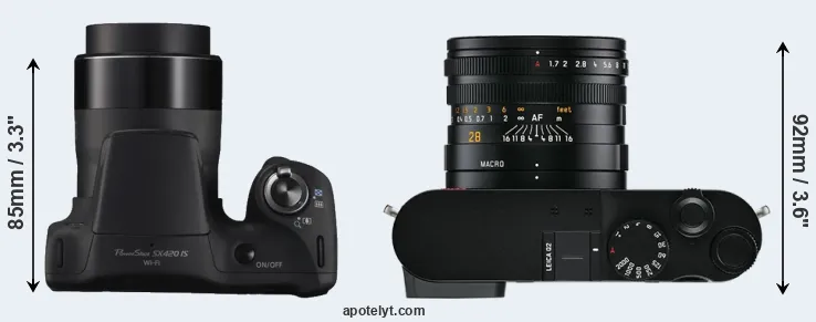An illustration of the physical size and weight of the Canon SX420 and the Leica Q2 is provided in the side-by-side display below. The two cameras are presented according to their relative size. Three consecutive perspectives from the front, the top, and the back are available. All width, height and depth dimensions are rounded to the nearest millimeter.