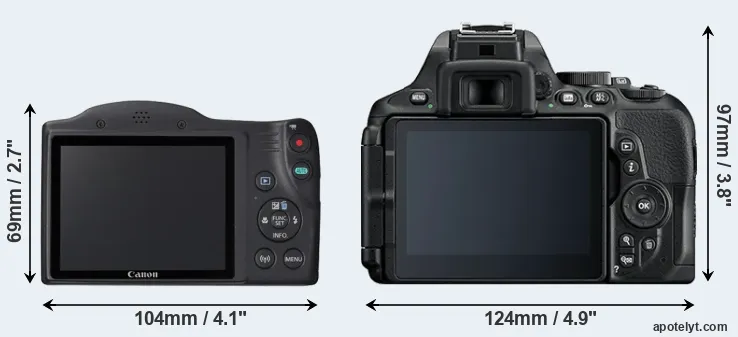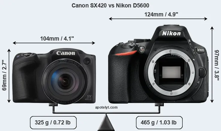 The side-by-side display below illustrates the physical size and weight of the Canon SX420 and the Nikon D5600. The two cameras are presented according to their relative size. Three consecutive views from the front, the top, and the rear side are shown. All width, height and depth measures are rounded to the nearest millimeter.