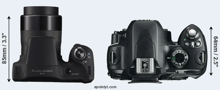 The physical size and weight of the Canon SX420 and the Nikon D60 are illustrated in the side-by-side display below. The two cameras are presented according to their relative size. Three consecutive views from the front, the top, and the rear side are shown. All size dimensions are rounded to the nearest millimeter.