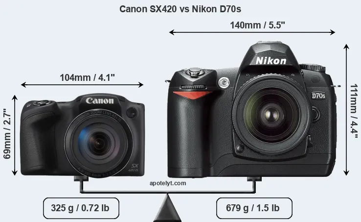 The physical size and weight of the Canon SX420 and the Nikon D70s are illustrated in the side-by-side display below. The two cameras are presented according to their relative size. Three consecutive views from the front, the top, and the rear side are shown. All width, height and depth measures are rounded to the nearest millimeter.