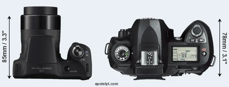 If the front view area (width x height) of the cameras is taken as an aggregate measure of their size, the Nikon D70s is considerably larger (117 percent) than the Canon SX420. In this context, it is worth noting that neither the SX420 nor the D70s are weather-sealed.