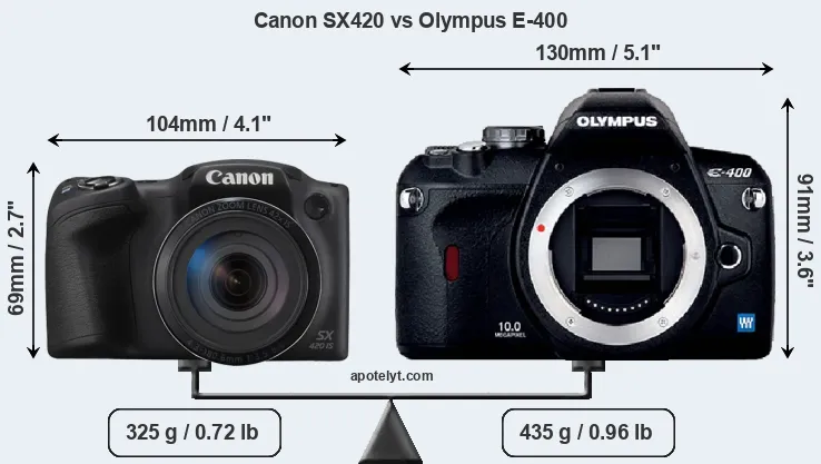 The physical size and weight of the Canon SX420 and the Olympus E-400 are illustrated in the side-by-side display below. The two cameras are presented according to their relative size. Three consecutive views from the front, the top, and the rear side are shown. All width, height and depth measures are rounded to the nearest millimeter.