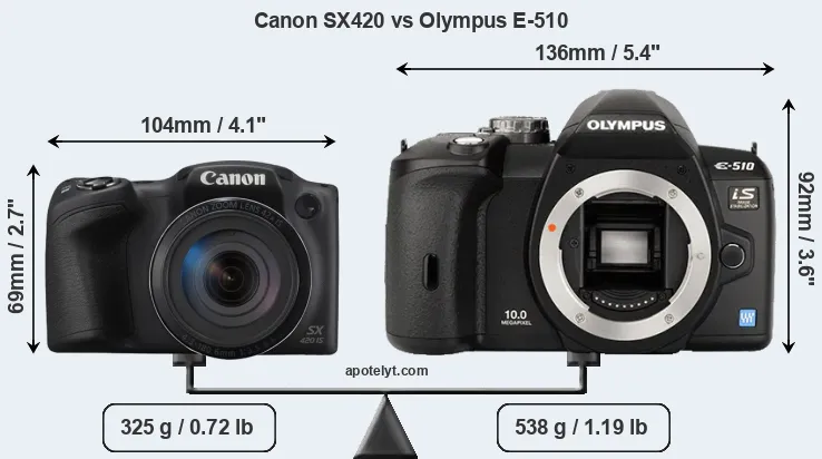 An illustration of the physical size and weight of the Canon SX420 and the Olympus E-510 is provided in the side-by-side display below. The two cameras are presented according to their relative size. Three consecutive perspectives from the front, the top, and the back are available. All width, height and depth dimensions are rounded to the nearest millimeter.