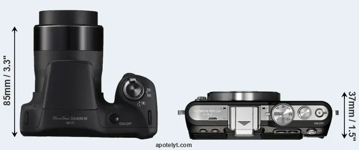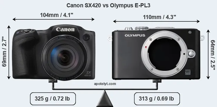 The physical size and weight of the Canon SX420 and the Olympus E-PL3 are illustrated in the side-by-side display below. The two cameras are presented according to their relative size. Three consecutive views from the front, the top, and the rear side are shown. All width, height and depth measures are rounded to the nearest millimeter.