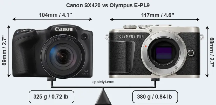 The above size and weight comparisons are to some extent incomplete and possibly misleading, as the SX420 has a lens built in, whereas the E-PL9 is an interchangeable lens camera that requires a separate lens. Attaching the latter will add extra weight and bulk to the setup. You can compare the optics available for the E-PL9 and their specifications in the Micro Four Thirds Lens Catalog.