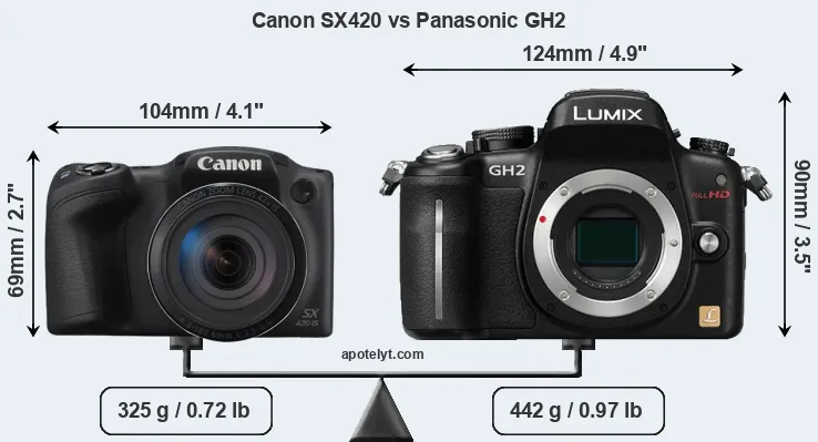 An illustration of the physical size and weight of the Canon SX420 and the Panasonic GH2 is provided in the side-by-side display below. The two cameras are presented according to their relative size. Three successive views from the front, the top, and the rear are shown. All width, height and depth dimensions are rounded to the nearest millimeter.