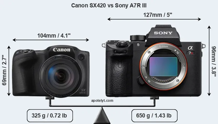 The physical size and weight of the Canon SX420 and the Sony A7R III are illustrated in the side-by-side display below. The two cameras are presented according to their relative size. Three successive views from the front, the top, and the rear are shown. All width, height and depth dimensions are rounded to the nearest millimeter.