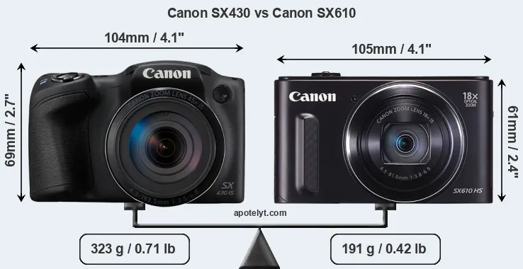 An illustration of the physical size and weight of the Canon SX430 and the Canon SX610 is provided in the side-by-side display below. The two cameras are presented according to their relative size. Three successive views from the front, the top, and the rear are shown. All width, height and depth measures are rounded to the nearest millimeter.