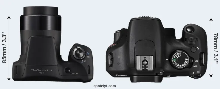 The physical size and weight of the Canon SX430 and the Canon T5 are illustrated in the side-by-side display below. The two cameras are presented according to their relative size. Three consecutive perspectives from the front, the top, and the back are available. All width, height and depth measures are rounded to the nearest millimeter.