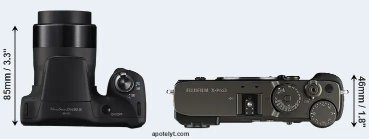 The physical size and weight of the Canon SX430 and the Fujifilm X-Pro3 are illustrated in the side-by-side display below. The two cameras are presented according to their relative size. Three consecutive perspectives from the front, the top, and the back are available. All width, height and depth measures are rounded to the nearest millimeter.