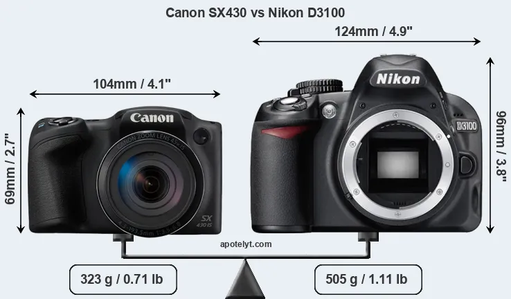 An illustration of the physical size and weight of the Canon SX430 and the Nikon D3100 is provided in the side-by-side display below. The two cameras are presented according to their relative size. Three consecutive views from the front, the top, and the rear side are shown. All width, height and depth measures are rounded to the nearest millimeter.