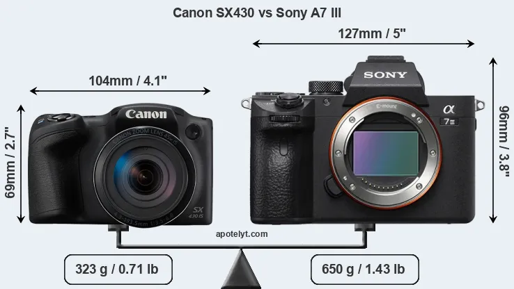An illustration of the physical size and weight of the Canon SX430 and the Sony A7 III is provided in the side-by-side display below. The two cameras are presented according to their relative size. Three consecutive views from the front, the top, and the rear side are shown. All size dimensions are rounded to the nearest millimeter.