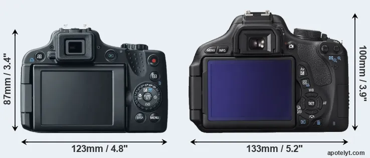 The Canon PowerShot SX50 HS and the Canon EOS Rebel T3i (labelled Canon 600D in some countries) are two digital cameras that were revealed to the public, respectively, in September 2012 and February 2011. The SX50 is a fixed lens compact, while the T3i is a DSLR. The cameras are based on a 1/2.3-inch (SX50) and an APS-C (T3i) sensor. The SX50 has a resolution of 12 megapixels, whereas the T3i provides 17.9 MP.