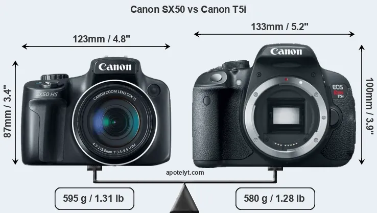 An illustration of the physical size and weight of the Canon SX50 and the Canon T5i is provided in the side-by-side display below. The two cameras are presented according to their relative size. Three consecutive views from the front, the top, and the rear side are shown. All width, height and depth dimensions are rounded to the nearest millimeter.