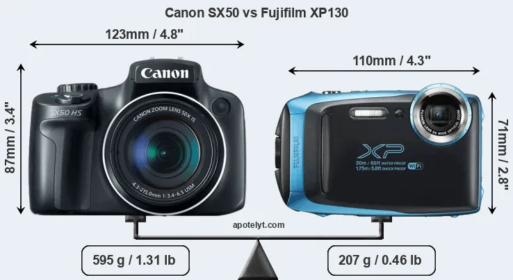 The side-by-side display below illustrates the physical size and weight of the Canon SX50 and the Fujifilm XP130. The two cameras are presented according to their relative size. Three consecutive perspectives from the front, the top, and the back are available. All width, height and depth measures are rounded to the nearest millimeter.