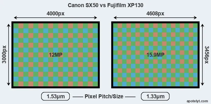 While the two cameras under review share the same sensor size, the XP130 offers a higher resolution of 15.9 megapixels, compared with 12 MP of the SX50. This megapixels advantage translates into a 15 percent gain in linear resolution. On the other hand, these sensor specs imply that the XP130 has a higher pixel density and a smaller size of the individual pixel (with a pixel pitch of 1.33μm versus 1.53μm for the SX50). However, it should be noted that the XP130 is much more recent (by 5 years and 4 months) than the SX50, and its sensor will have benefitted from technological advances during this time that compensate for the smaller pixel size. Coming back to sensor resolution, it should be mentioned that the XP130 has no anti-alias filter installed, so that it can capture all the detail its sensor resolves.