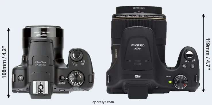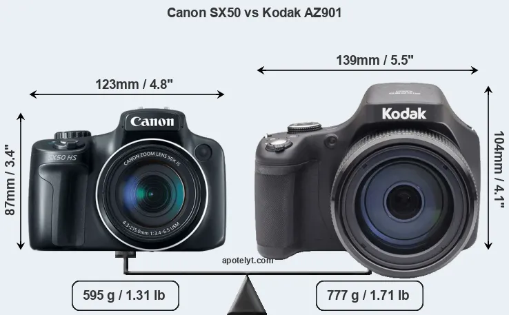 The physical size and weight of the Canon SX50 and the Kodak AZ901 are illustrated in the side-by-side display below. The two cameras are presented according to their relative size. Three consecutive perspectives from the front, the top, and the back are available. All width, height and depth dimensions are rounded to the nearest millimeter.