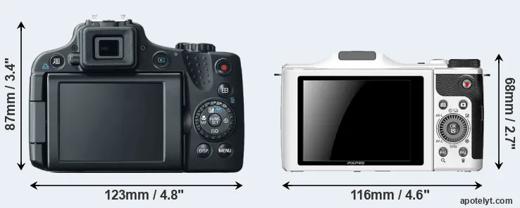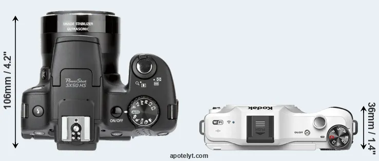 The Canon PowerShot SX50 HS and the Kodak PixPro S-1 are two digital cameras that were announced, respectively, in September 2012 and January 2012. The SX50 is a fixed lens compact, while the S-1 is a mirrorless interchangeable lens camera. The cameras are based on a 1/2.3-inch (SX50) and a Four Thirds (S-1) sensor. The Canon has a resolution of 12 megapixels, whereas the Kodak provides 16.1 MP.