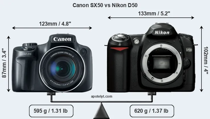 The physical size and weight of the Canon SX50 and the Nikon D50 are illustrated in the side-by-side display below. The two cameras are presented according to their relative size. Three consecutive views from the front, the top, and the rear side are shown. All width, height and depth dimensions are rounded to the nearest millimeter.