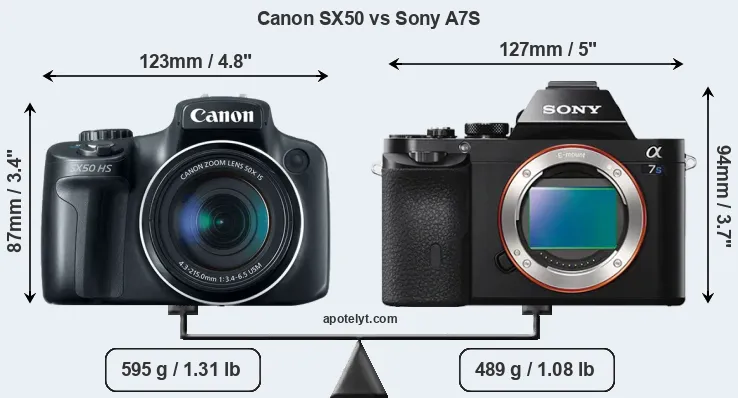 An illustration of the physical size and weight of the Canon SX50 and the Sony A7S is provided in the side-by-side display below. The two cameras are presented according to their relative size. Three consecutive perspectives from the front, the top, and the back are available. All size dimensions are rounded to the nearest millimeter.