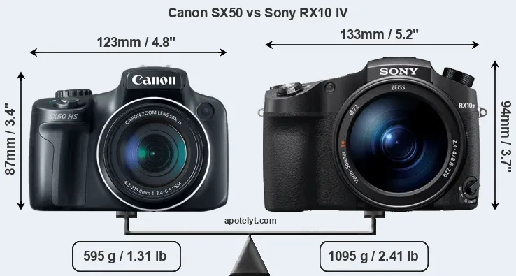 If the front view area (width x height) of the cameras is taken as an aggregate measure of their size, the Sony RX10 IV is notably larger (17 percent) than the Canon SX50. Moreover, the RX10 IV is substantially heavier (84 percent) than the SX50. It is noteworthy in this context that the RX10 IV is splash and dust-proof, while the SX50 does not feature any corresponding weather-sealing.