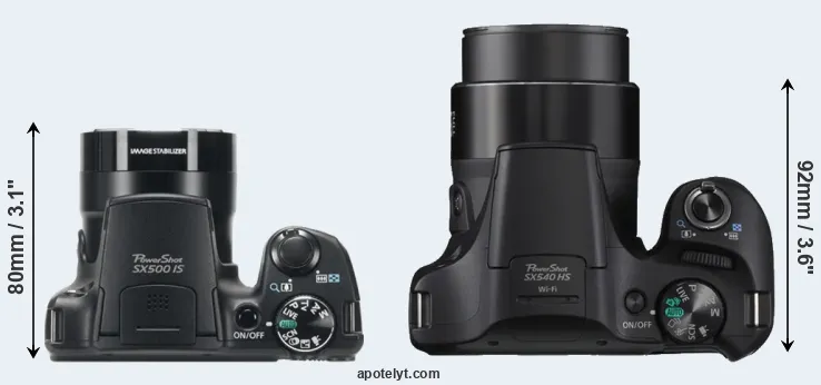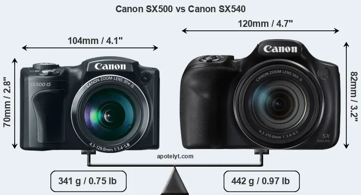 An illustration of the physical size and weight of the Canon SX500 and the Canon SX540 is provided in the side-by-side display below. The two cameras are presented according to their relative size. Three successive views from the front, the top, and the rear are shown. All size dimensions are rounded to the nearest millimeter.