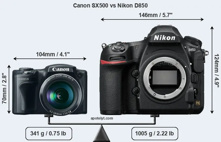 The above size and weight comparisons are to some extent incomplete and possibly misleading, as the SX500 has a lens built in, whereas the D850 is an interchangeable lens camera that requires a separate lens. Attaching the latter will add extra weight and bulk to the setup. You can compare the optics available for the D850 and their specifications in the Nikon Lens Catalog.