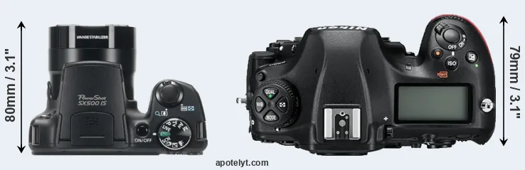 If the front view area (width x height) of the cameras is taken as an aggregate measure of their size, the Nikon D850 is considerably larger (149 percent) than the Canon SX500. It is noteworthy in this context that the D850 is splash and dust-proof, while the SX500 does not feature any corresponding weather-sealing.