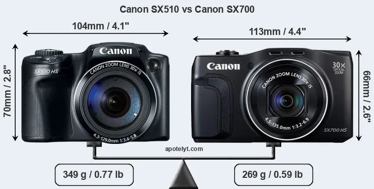 The physical size and weight of the Canon SX510 and the Canon SX700 are illustrated in the side-by-side display below. The two cameras are presented according to their relative size. Three consecutive perspectives from the front, the top, and the back are available. All width, height and depth measures are rounded to the nearest millimeter.