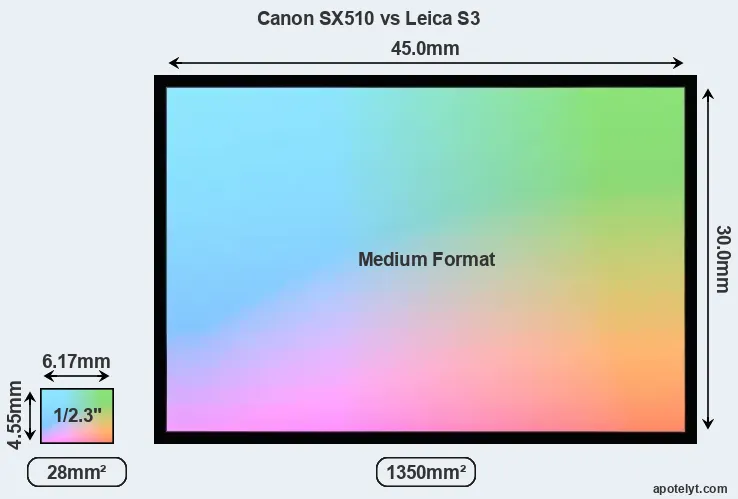 Of the two cameras under consideration, the Canon SX510 features a 1/2.3-inch sensor and the Leica S3 a medium format sensor. The sensor area in the S3 is 4721 percent bigger. As a result of these sensor size differences, the cameras have a format factor of, respectively, 5.6 and 0.8. The sensor in the SX510 has a native 4:3 aspect ratio, while the one in the S3 offers a 3:2 aspect.
