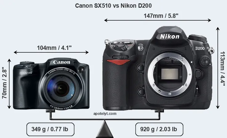 If the front view area (width x height) of the cameras is taken as an aggregate measure of their size, the Nikon D200 is considerably larger (128 percent) than the Canon SX510. It is noteworthy in this context that the D200 is splash and dust-proof, while the SX510 does not feature any corresponding weather-sealing.