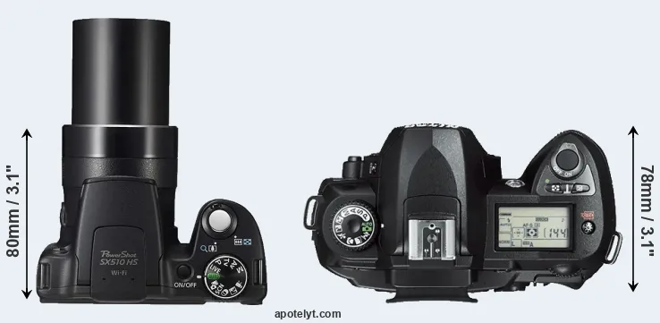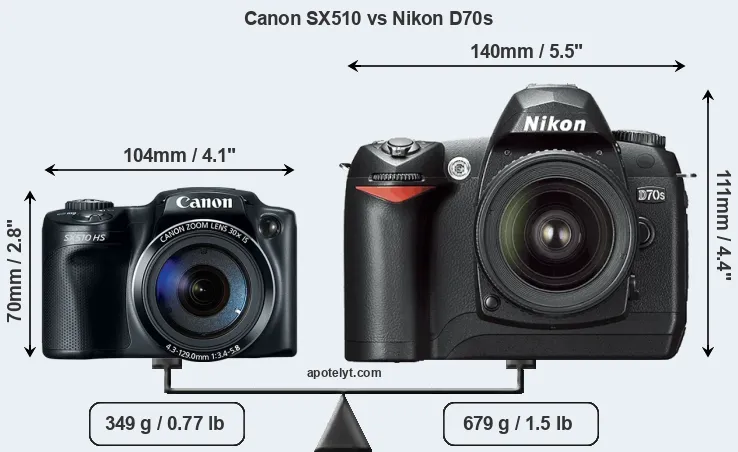 If the front view area (width x height) of the cameras is taken as an aggregate measure of their size, the Nikon D70s is considerably larger (113 percent) than the Canon SX510. In this context, it is worth noting that neither the SX510 nor the D70s are weather-sealed.