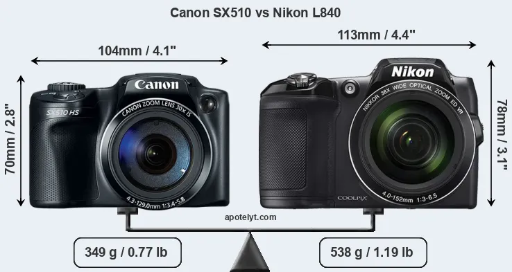 The physical size and weight of the Canon SX510 and the Nikon L840 are illustrated in the side-by-side display below. The two cameras are presented according to their relative size. Three successive views from the front, the top, and the rear are shown. All width, height and depth measures are rounded to the nearest millimeter.