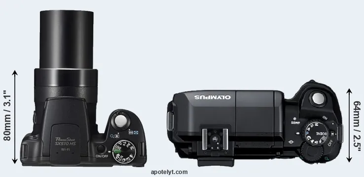 The physical size and weight of the Canon SX510 and the Olympus E-300 are illustrated in the side-by-side display below. The two cameras are presented according to their relative size. Three consecutive perspectives from the front, the top, and the back are available. All width, height and depth measures are rounded to the nearest millimeter.