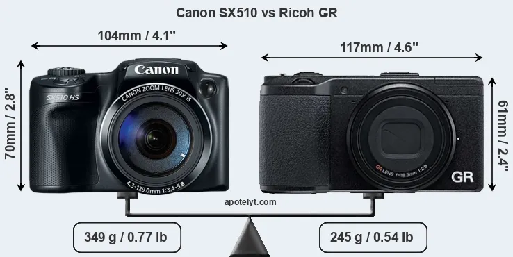 An illustration of the physical size and weight of the Canon SX510 and the Ricoh GR is provided in the side-by-side display below. The two cameras are presented according to their relative size. Three successive views from the front, the top, and the rear are shown. All size dimensions are rounded to the nearest millimeter.