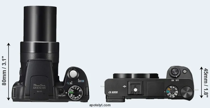 The physical size and weight of the Canon SX510 and the Sony A6000 are illustrated in the side-by-side display below. The two cameras are presented according to their relative size. Three consecutive perspectives from the front, the top, and the back are available. All width, height and depth measures are rounded to the nearest millimeter.