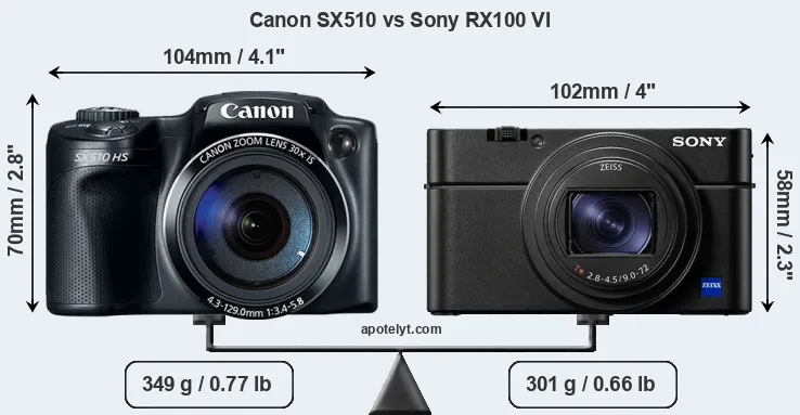 If the front view area (width x height) of the cameras is taken as an aggregate measure of their size, the Sony RX100 VI is notably smaller (19 percent) than the Canon SX510. Moreover, the RX100 VI is markedly lighter (14 percent) than the SX510. In this context, it is worth noting that neither the SX510 nor the RX100 VI are weather-sealed.