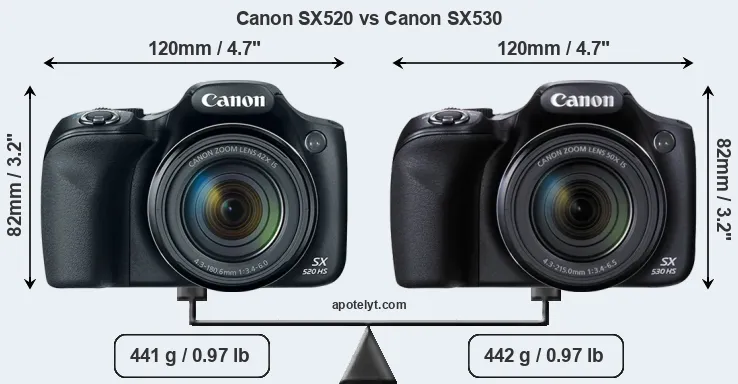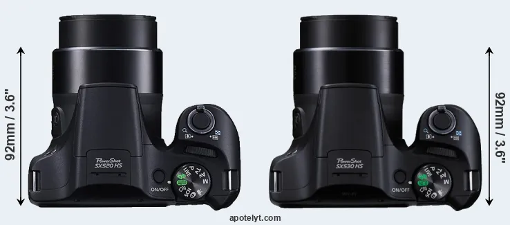 The physical size and weight of the Canon SX520 and the Canon SX530 are illustrated in the side-by-side display below. The two cameras are presented according to their relative size. Three consecutive views from the front, the top, and the rear side are shown. All width, height and depth measures are rounded to the nearest millimeter.